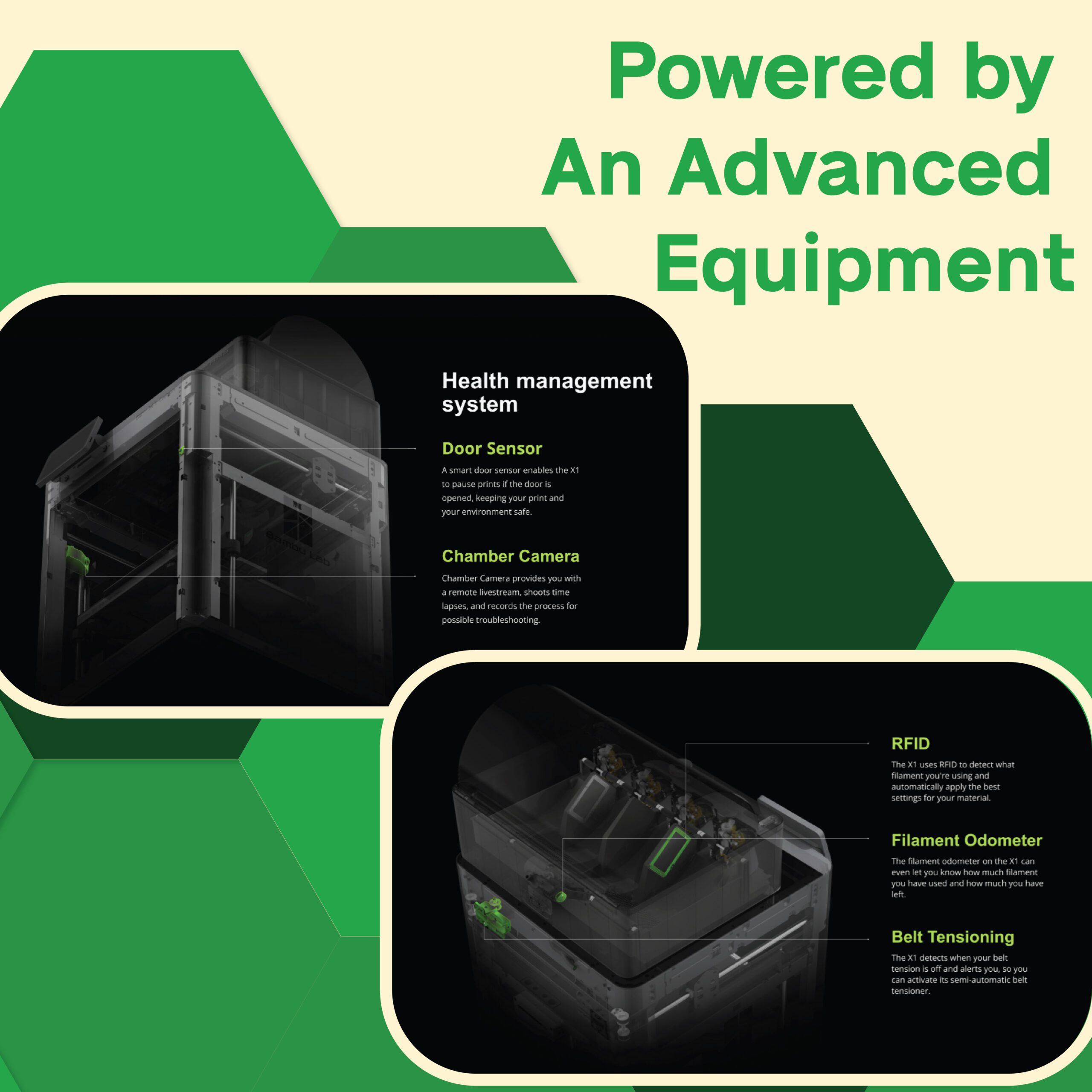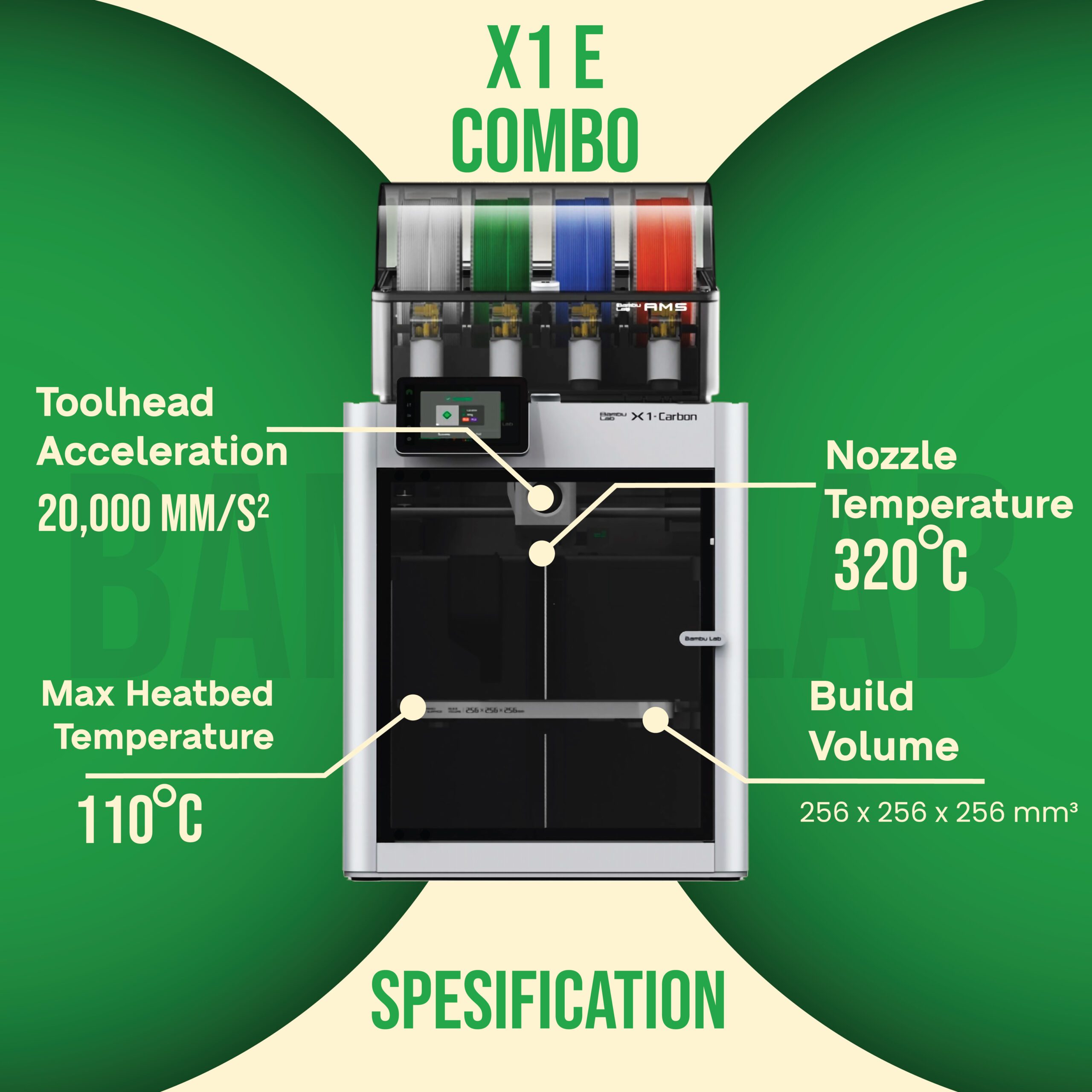 X1E dapat secara aktif mampu mengatur suhu pada chamber unit 3d printer. Suhu ruang yang dikontrol secara akurat (hingga 60°C atau 140°F)