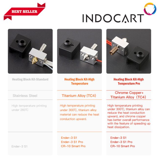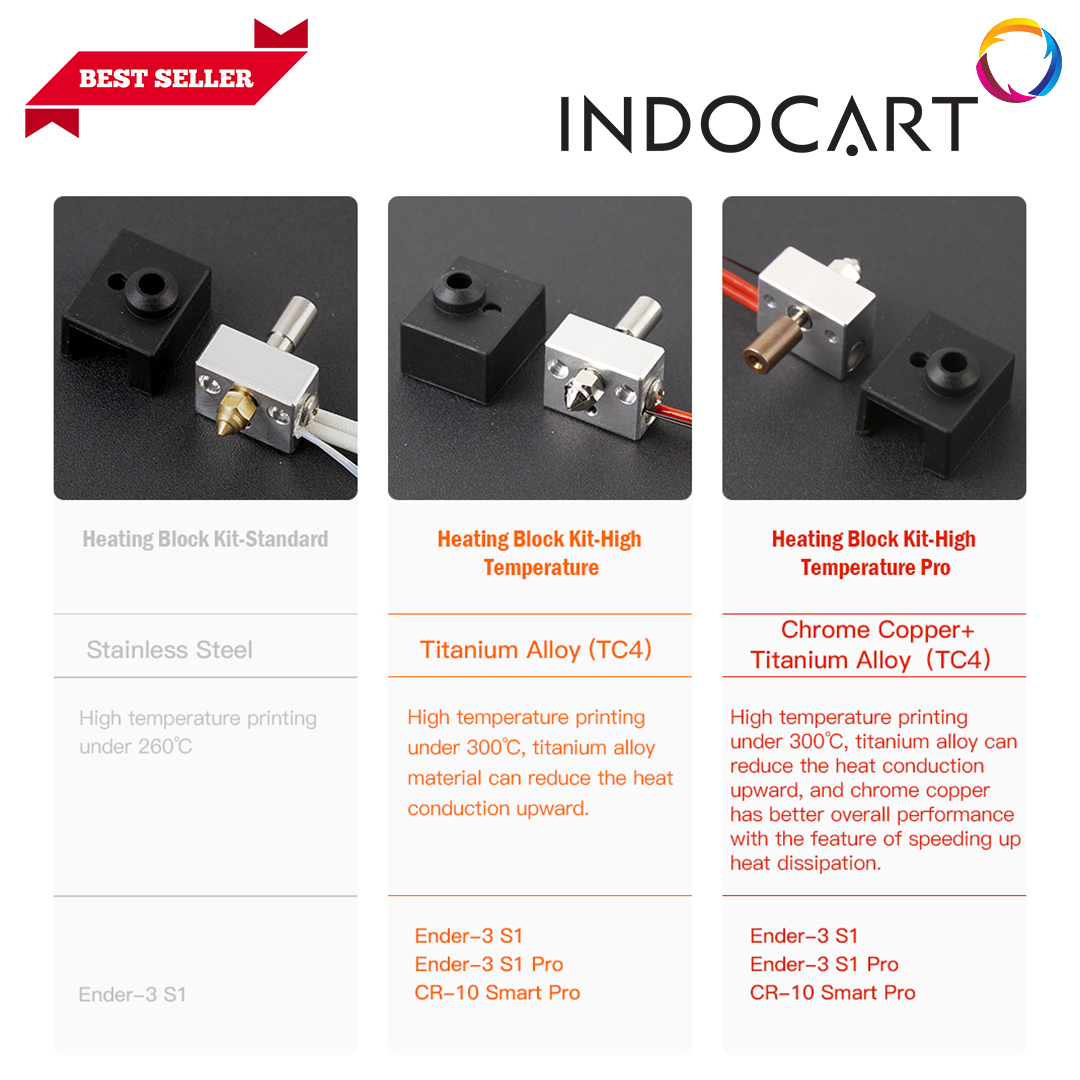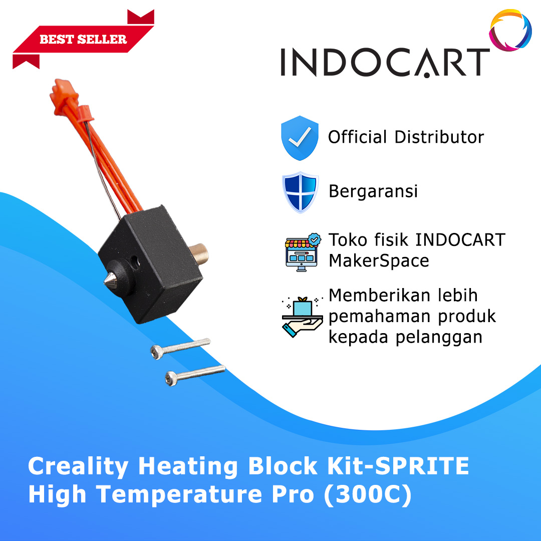 Heat block kit OEM asli dari Creality dengan kemampuan tahan suhu tinggi hingga 300°C, versi Pro untuk performa yang lebih unggul. Dirancang khusus untuk printer 3D Creality Ender 3S1Plus, 3S1, 3S1Pro, dan CR-10 Smart Pro, kit ini mendukung proses pencetakan dengan material suhu tinggi dan stabilitas suhu yang maksimal.