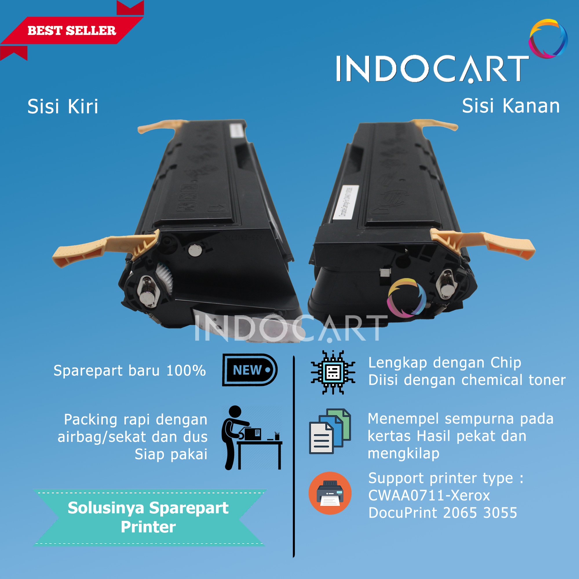 100% sparepart baru. Lengkap dengan segel untuk keamanan toner supaya tidak bocor.